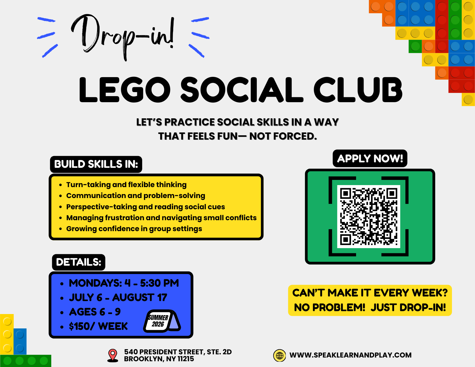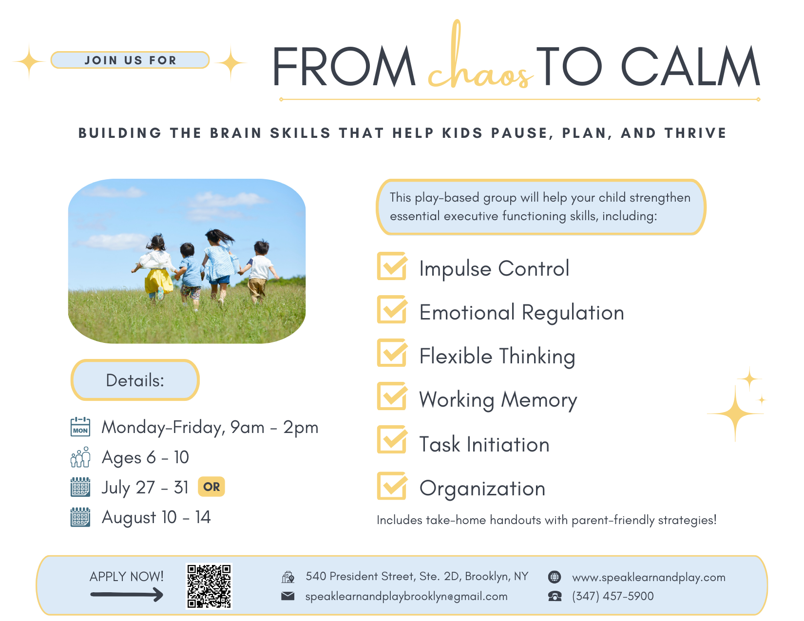 Through games, hands-on activities, and guided practice, kids learn how to pause before reacting, manage frustration, stay organized, and approach challenges with greater confidence. The goal is to help children build practical tools for everyday success—at school, at home, and with peers.