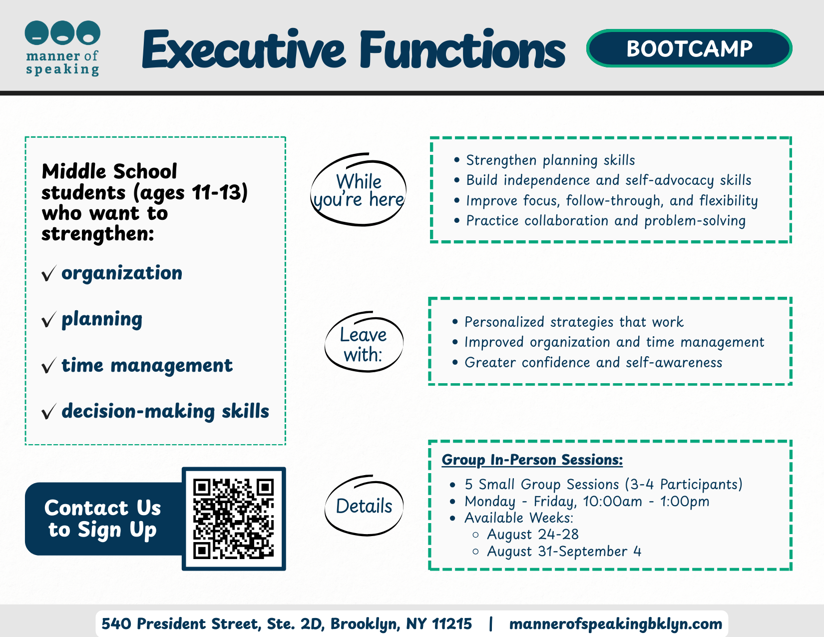 For middle school students (ages 11-13) who want to strengthen organization, planning, time management, and decision-making skills for school and life.