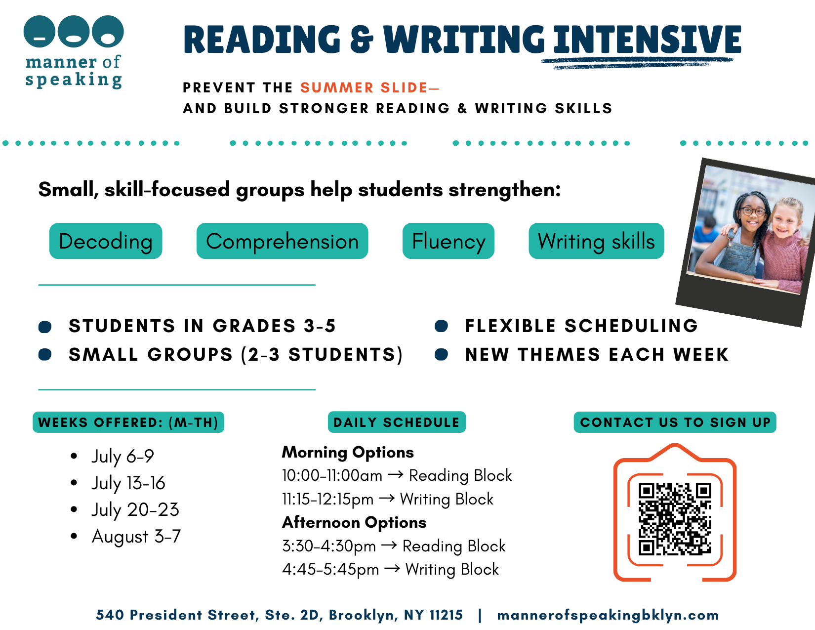 Give your child a boost in reading and writing this summer! Our small, skill-focused summer blocks help students strengthen decoding, fluency, comprehension, and writing skills in a fun, supportive environment.